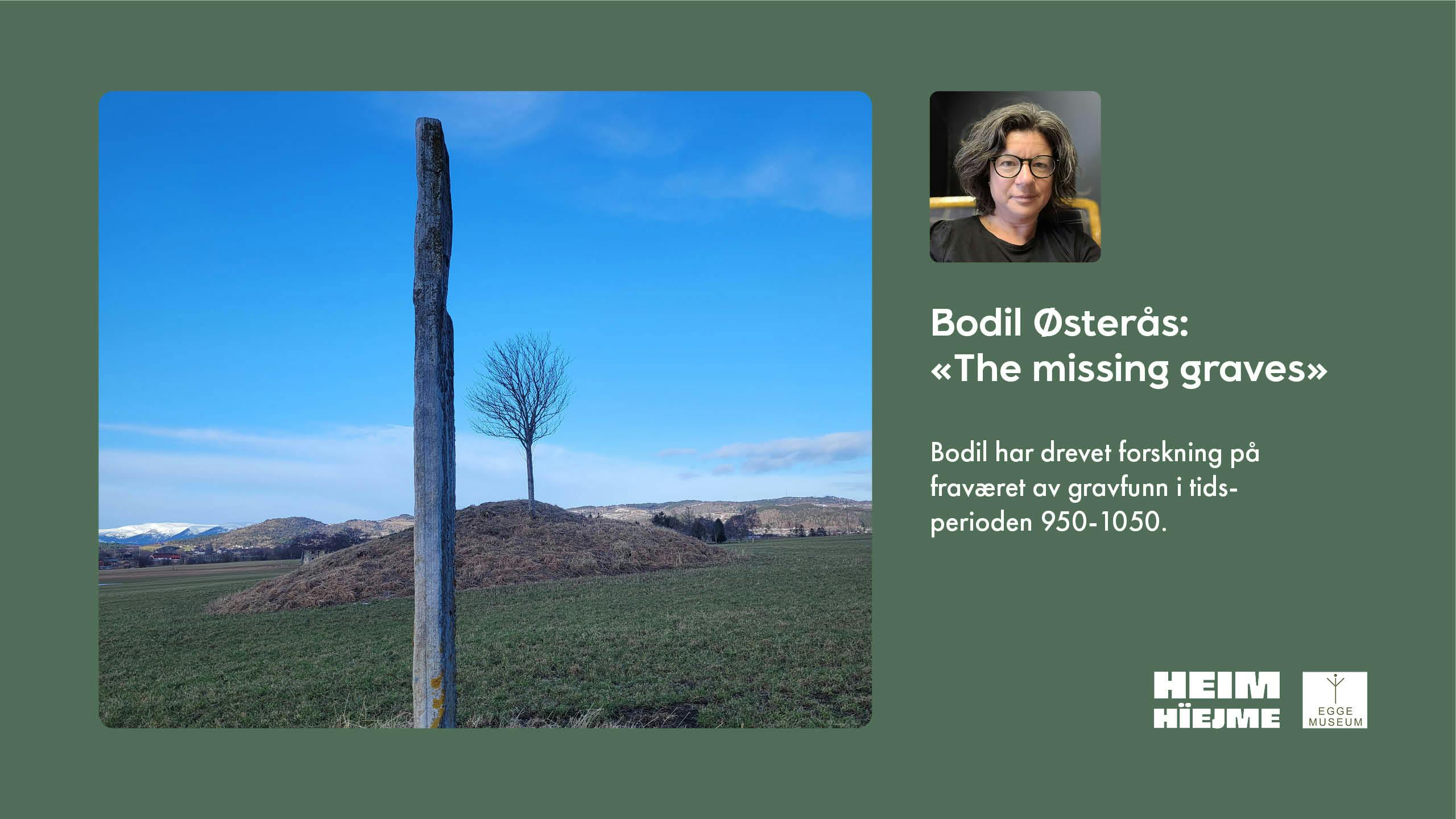 Bodil Østerås er fagleder forvaltning og konservator NMF ved Museene Arven. Hun er utdannet arkeolog, og har i de siste par årene drevet forskning på fraværet av gravfunn i tidsperioden 950-1050. Hør fortellingen og hvordan forskningsresultatet har blitt til ei utstilling i Steinkaret ved Steinkjer kulturhus: "De tapte gravers fortelling".