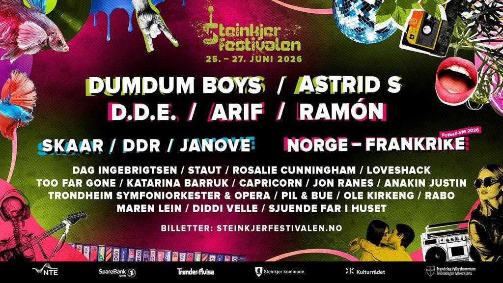 Steinkjer sentrum forvandles igjen til et pulserende festivalunivers 25.–27. juni 2026! Tre dager med musikk, folkefest og ekte trøndersk energi venter når blant(mange) andre Astrid S, D.D.E., RAMÒN, ARIF, DDR og Dumdum Boys inntar scenen!