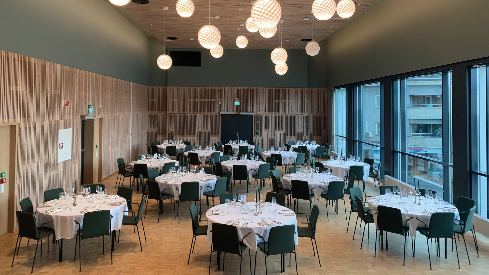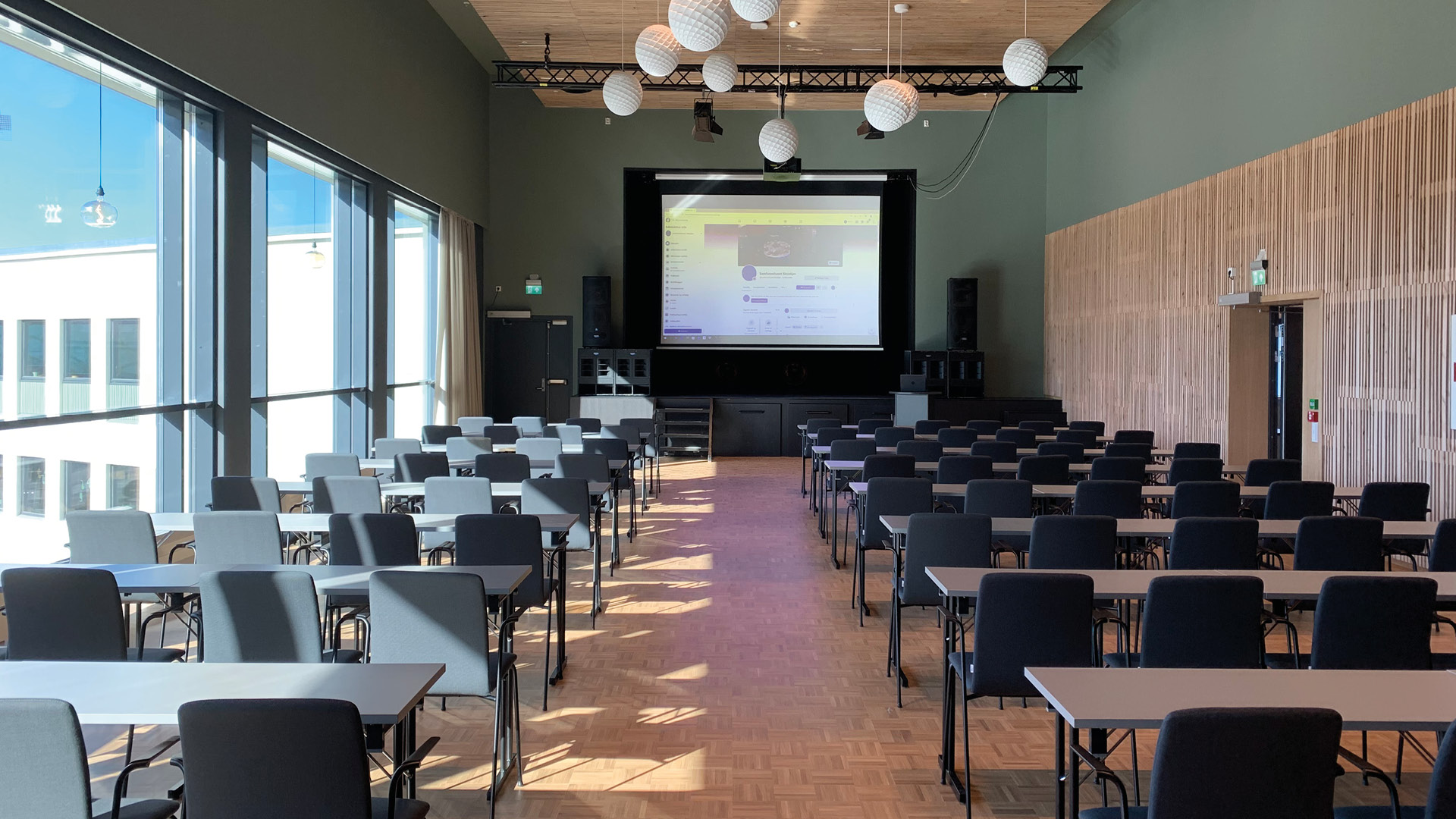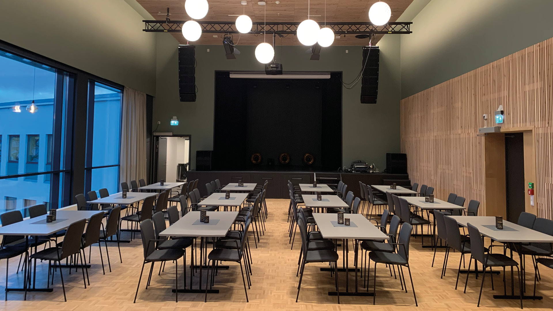 Festsalen er et stort og moderne lokale som passer godt for de fleste arrangementer. Her har du stor fleksibilitet med mulighet for ulike typer stoloppsett og møblering. Lokalet har også en liten scene som kan brukes til både foredrag og konserter.